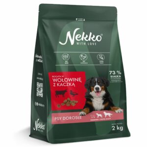 NEKKO Grain Free Adult Średnie i Duże Rasy Wołowina z Kaczką to kompleksowe pożywienie dla psów dorosłych, wyróżniające się bezpiecznym składem i wysoką smakowitością, uzyskaną bez sztucznych polepszaczy smaku i zapachu.
